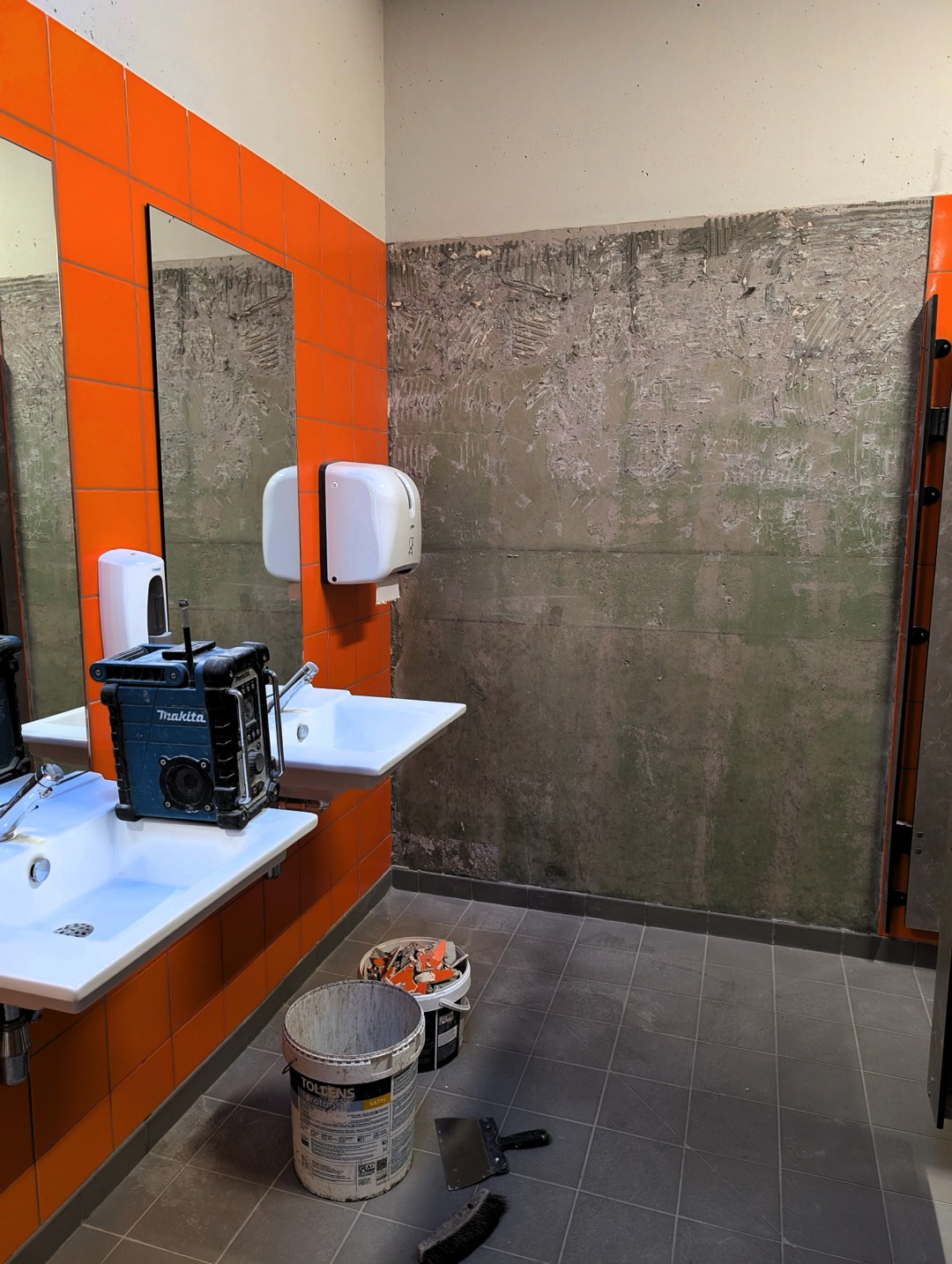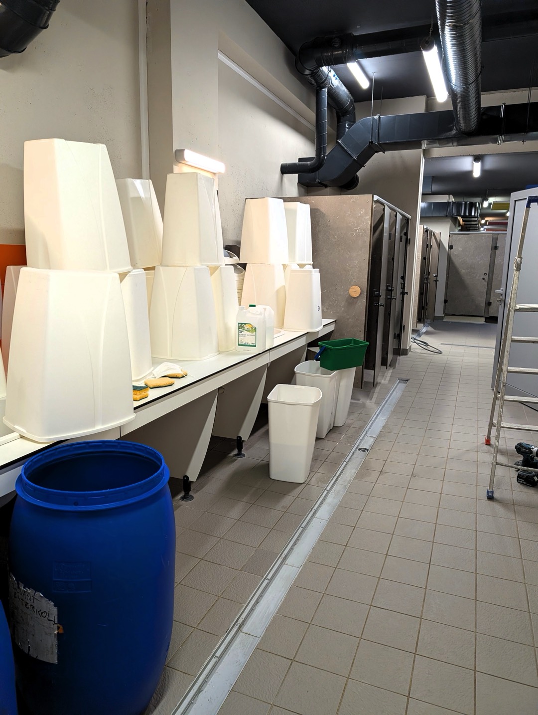 Les vestiaires bénéficient d’un nettoyage complet, du sol au plafond. Lavage haute pression, désinfection des casiers un par un, dépoussiérage des gaines d’aération et des sèche-cheveux, nettoyage des poubelles, rien n’est laissé de côté. Les grilles de caniveaux sont détartrées et le carrelage remplacé aux endroits nécessaires.