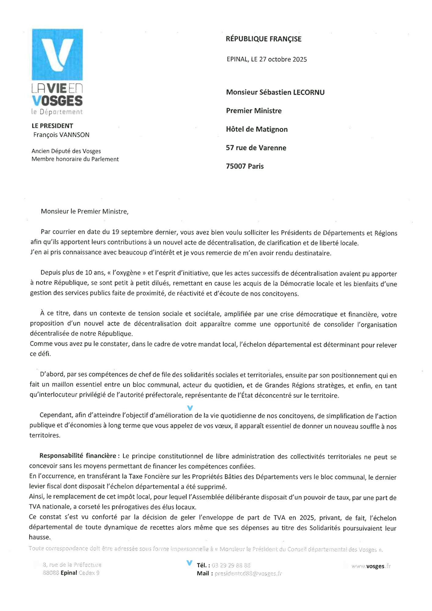 Le président du Conseil départemental des Vosges, François Vannson, appelle à un nouvel élan de décentralisation pour renforcer l’autonomie et l’action locale des Départements. Une prise de position transmise à la suite de l’appel du Premier ministre Sébastien Lecornu, adressé le 19 septembre dernier aux présidents de Départements et de Régions.