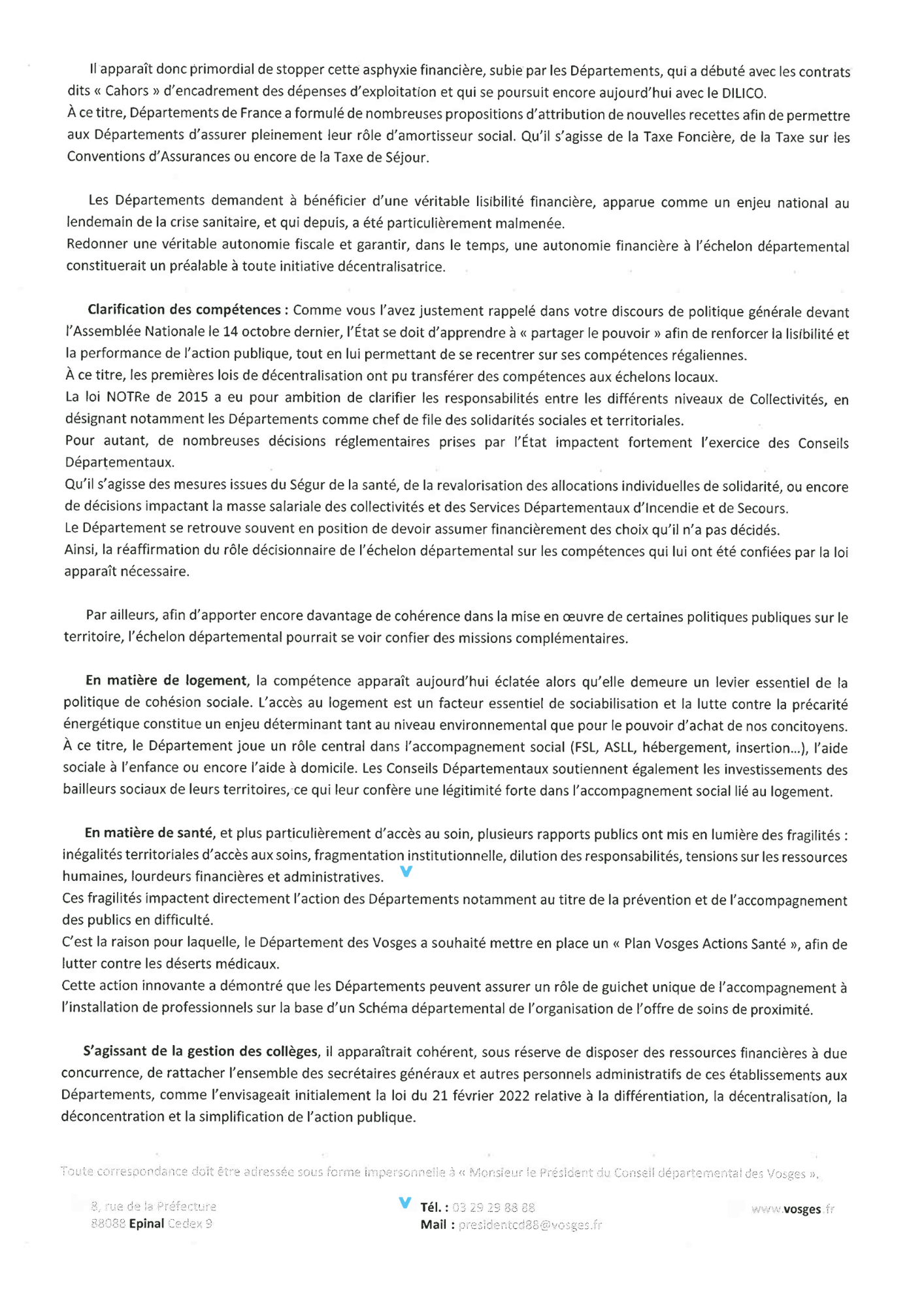 Il appelle à réaffirmer le rôle décisionnaire des Départements sur leurs compétences propres, notamment dans le logement, la santé de proximité et l’aménagement du territoire. Il cite notamment l’initiative « Plan Vosges Actions Santé », symbole d’une politique locale adaptée aux besoins du terrain. Mais il souligne qu’un transfert de nouvelles missions ne pourra se faire sans garanties financières.