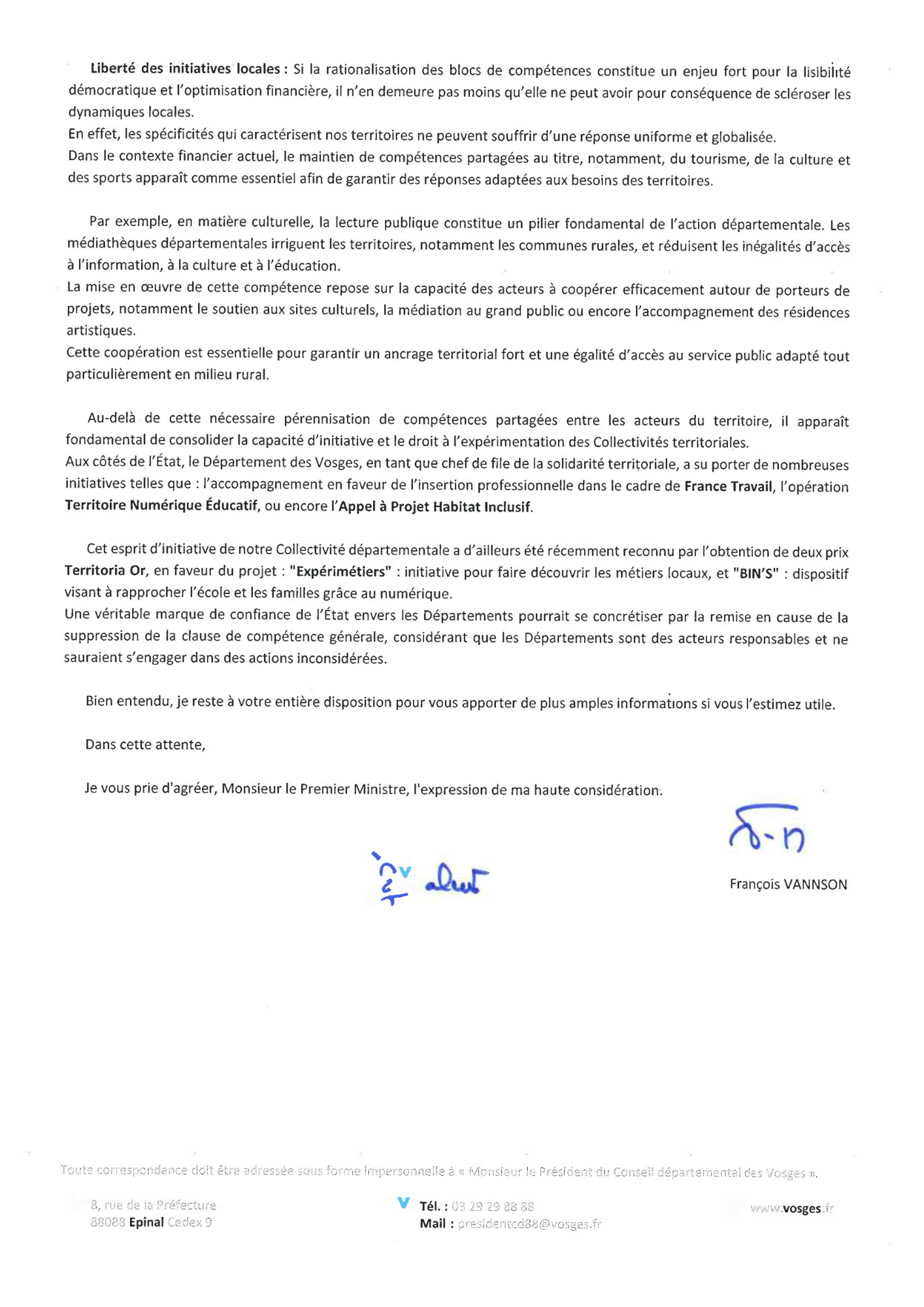 Enfin, il appelle à renouer une relation de confiance entre l’État et les Départements, notamment en réexaminant la suppression de la clause de compétence générale. Pour François Vannson, les Départements sont des collectivités responsables et doivent pouvoir agir librement au service de leurs habitants.