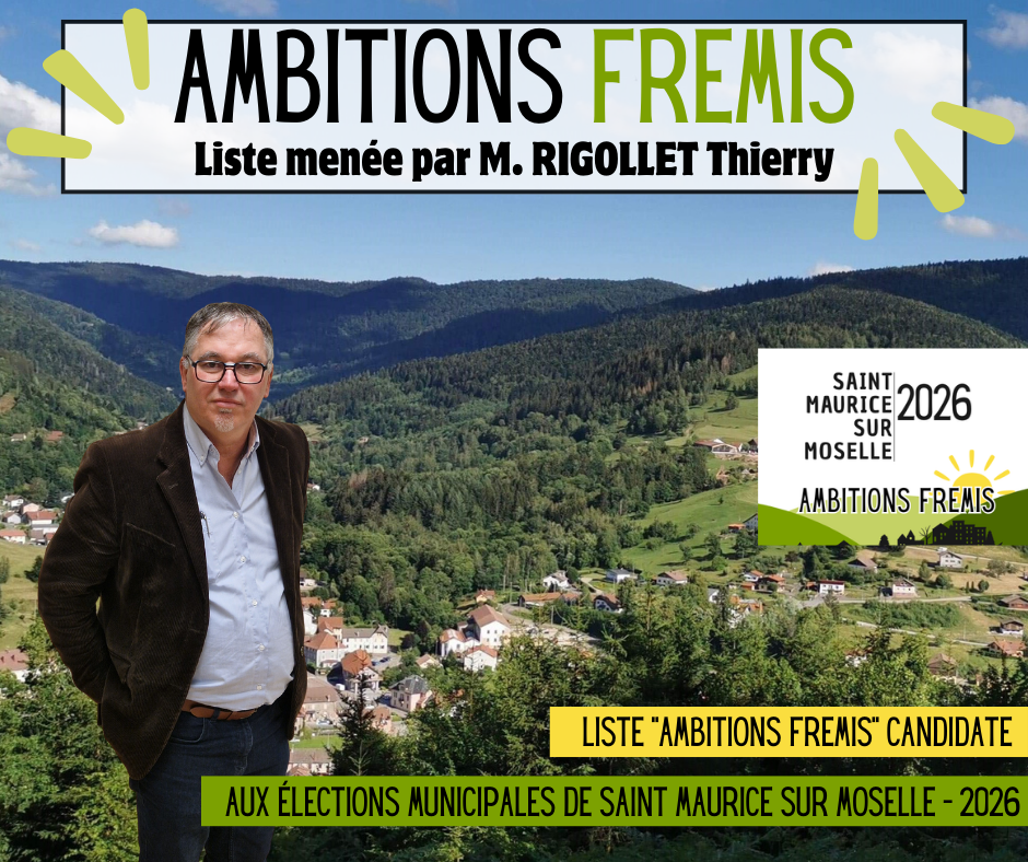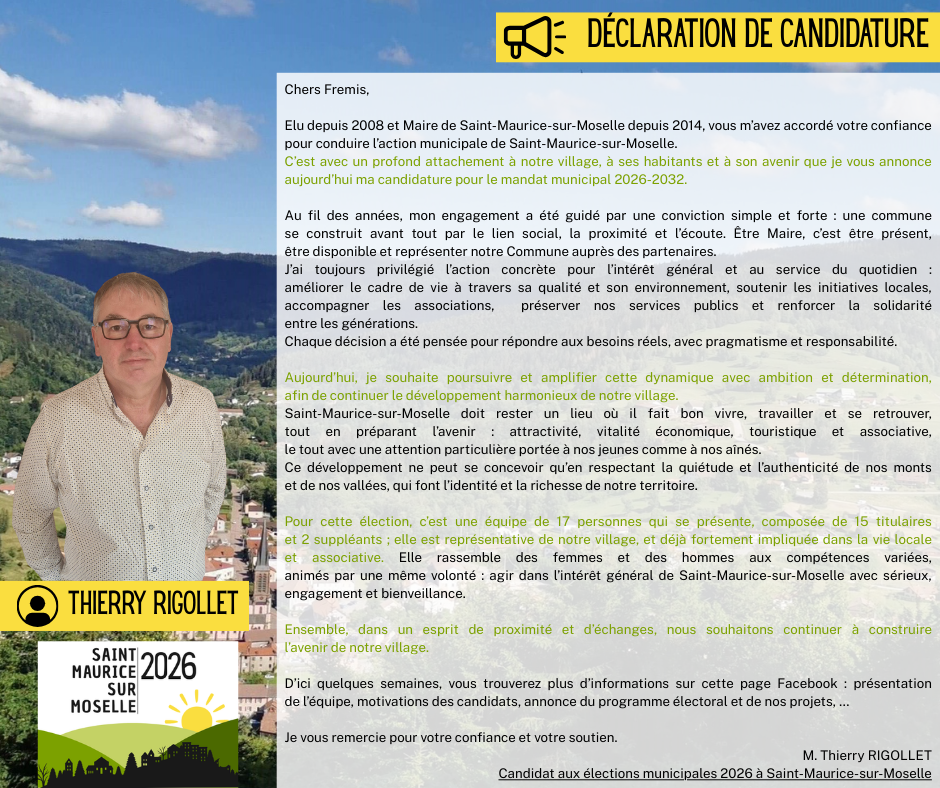 Comme indiqué au sein de sa déclaration de candidature, Monsieur Thierry RIGOLLET, élu depuis 2008 et maire depuis 2014, a décidé de se proposer à nouveau à la tête de la commune de Saint-Maurice-sur-Moselle pour le mandat 2026-2032.