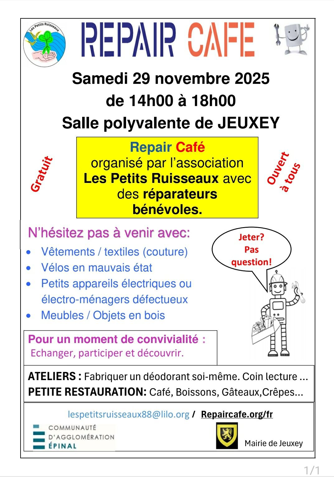 Nouvelle après-midi de réparations par des bénévoles ce samedi 29 novembre, avec l'association Les Petits Ruisseaux qui organise un Repair Café de 14h00 à 18h00 à la salle polyvalente de Jeuxey.