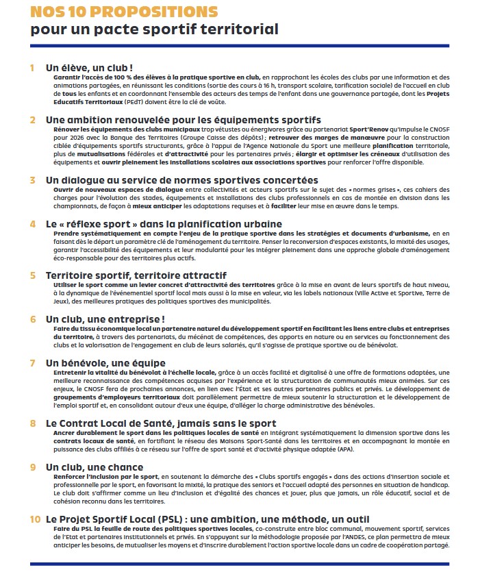 Pour parfaire ce partenariat sportif, le CNOSF propose 10 solutions :